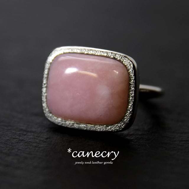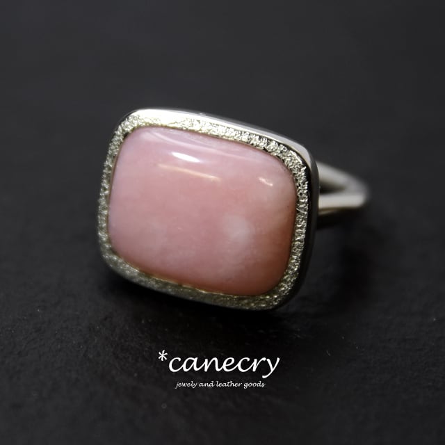 かわいいミルキーピンクなオパールをクッションスクエアのカボションにカットしました。存在感のある個性的なリングです。