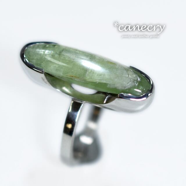 タンザニア産のグリーンカイヤナイトを細長いカボションに研磨した個性的で存在感のあるリングです。