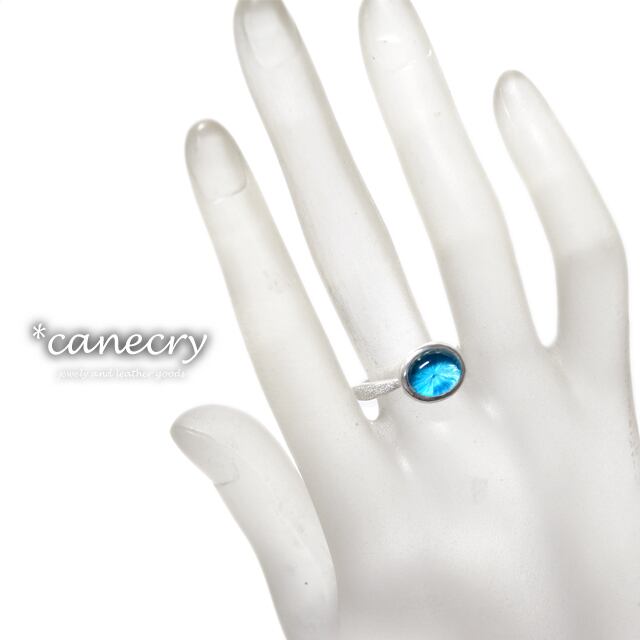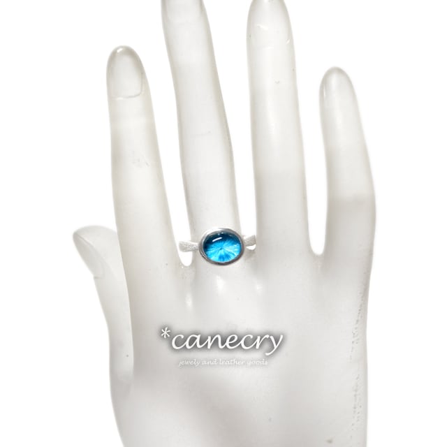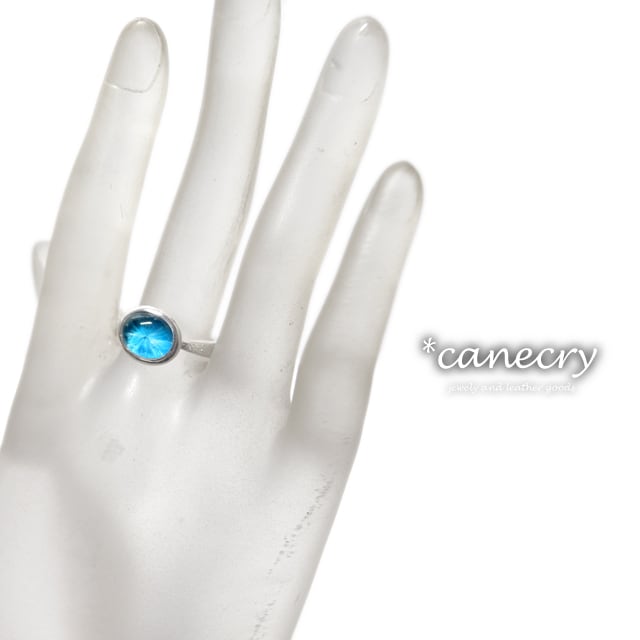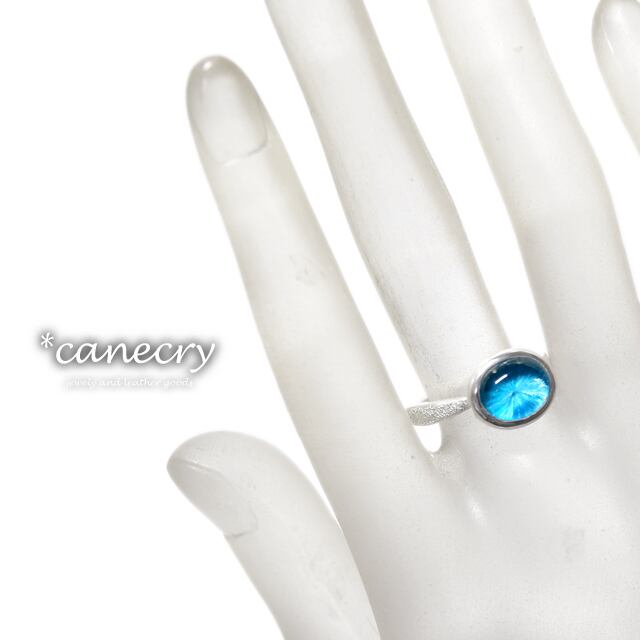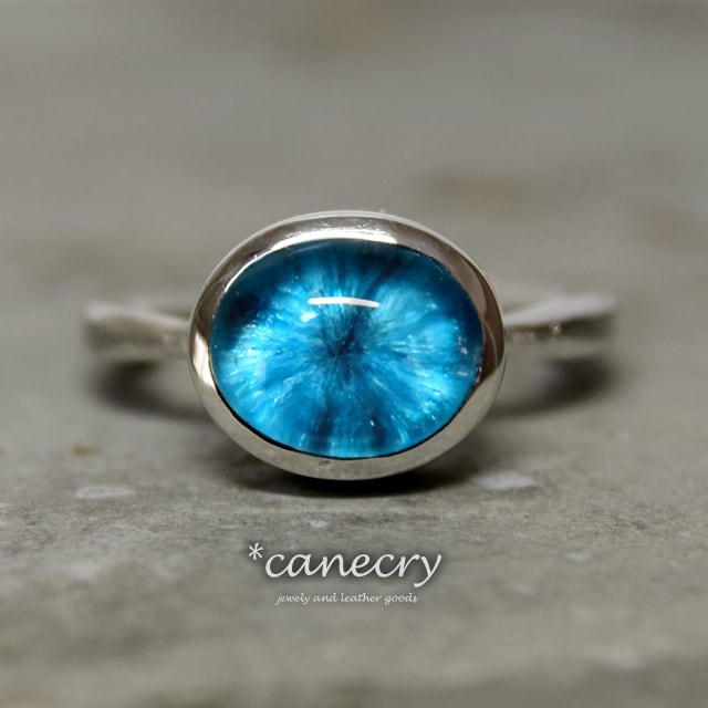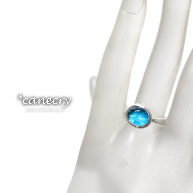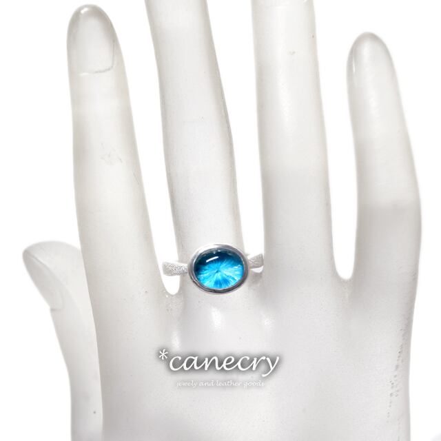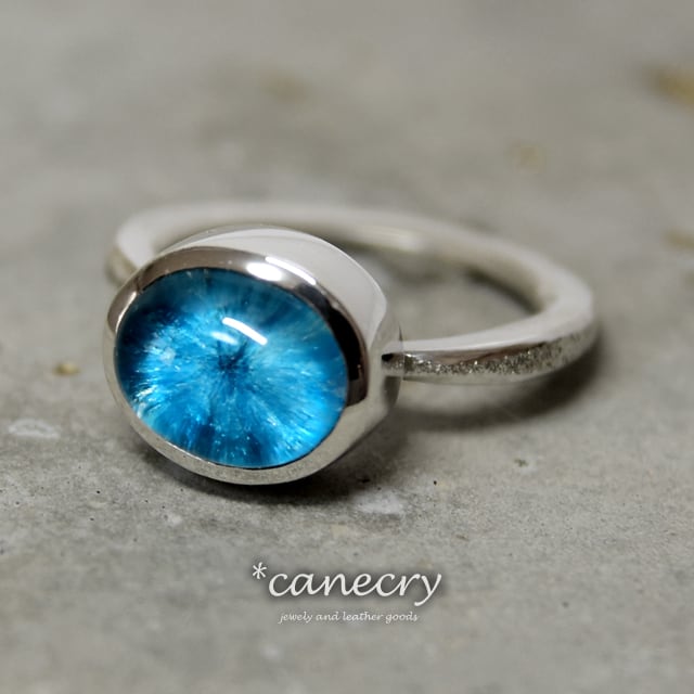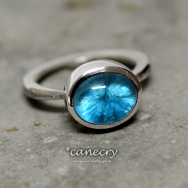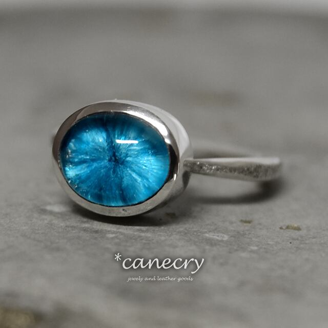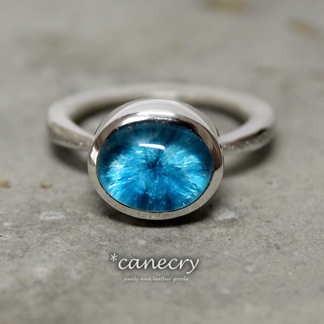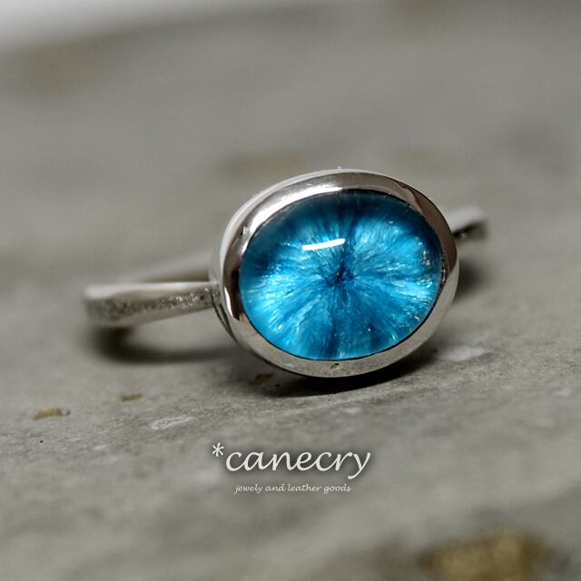 深いブルーの放射状の結晶が特徴的なカバンサイトのリングです。