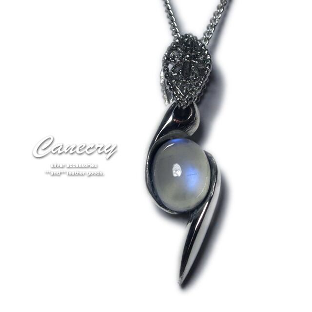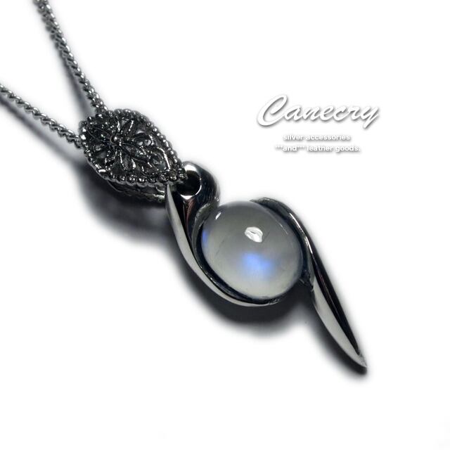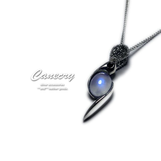 ムーンストーンの原石から削りだして磨き、流線型のシルバーパーツと組み合わせたネックレスです。