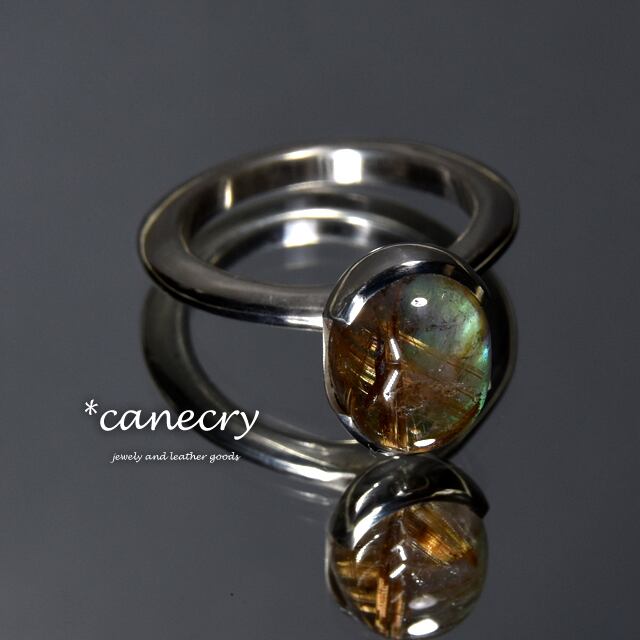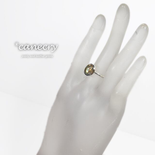 パウア貝のスライスにルチルクォーツを重ねたダブレット石を使ったシンプルなリングです。