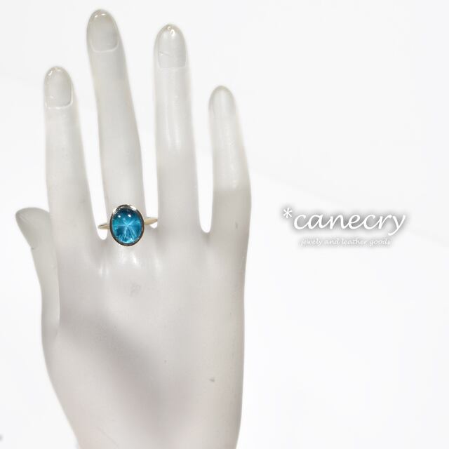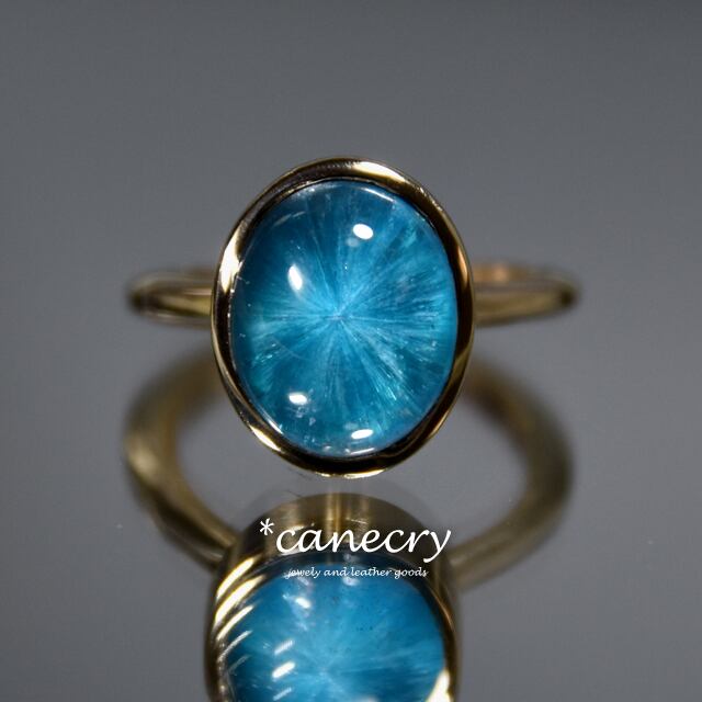 深いブルーの放射状の結晶が特徴的なカバンサイトのリングです。