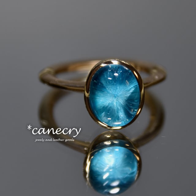 深いブルーの放射状の結晶が特徴的なカバンサイトのリングです。