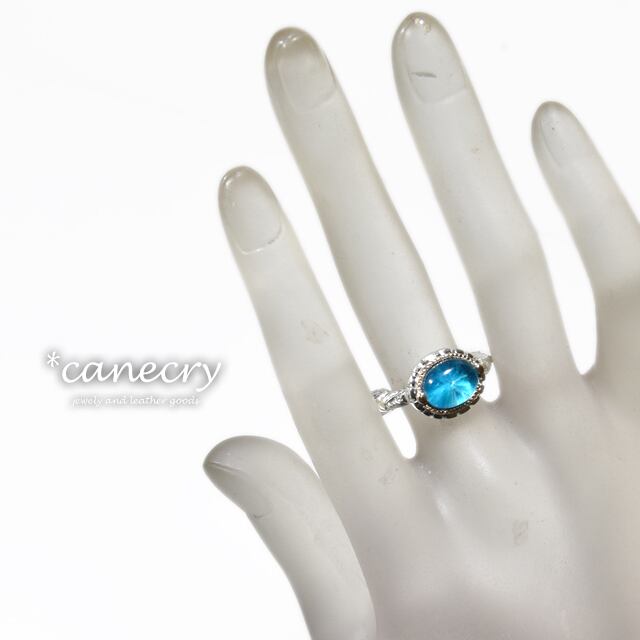 深いブルーの放射状の結晶が特徴的なカバンサイトのリングです。
