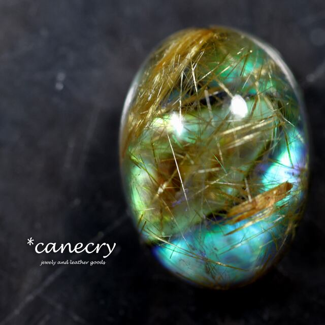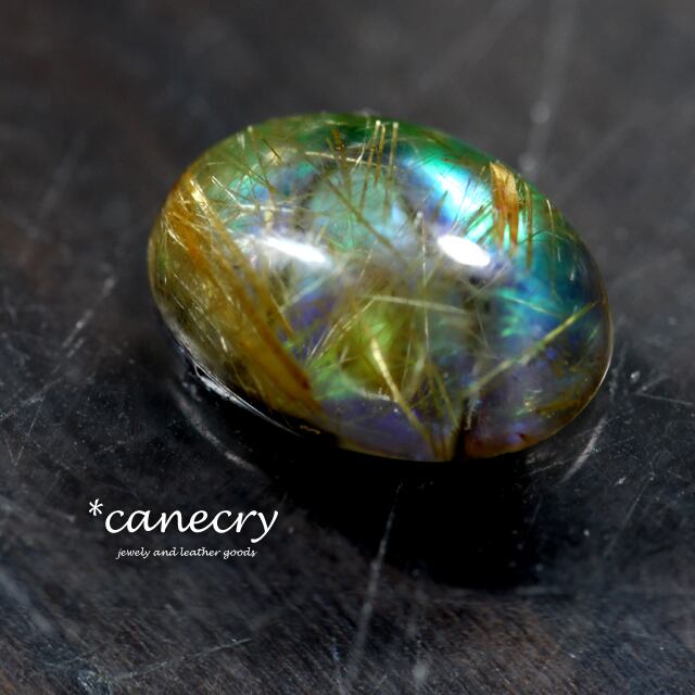 オーストラリア産のパウアシェルにエンジェル・ルチルクォーツと呼ばれる、細く、ふんわりとしたルチルを内包したクォーツをキャップしたダブレット・ストーンです。