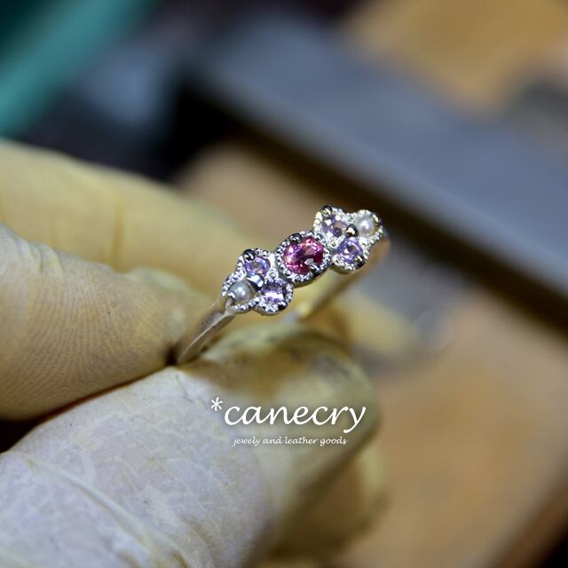 スピネルとサファイア、真珠を使ったシンプルなリングです