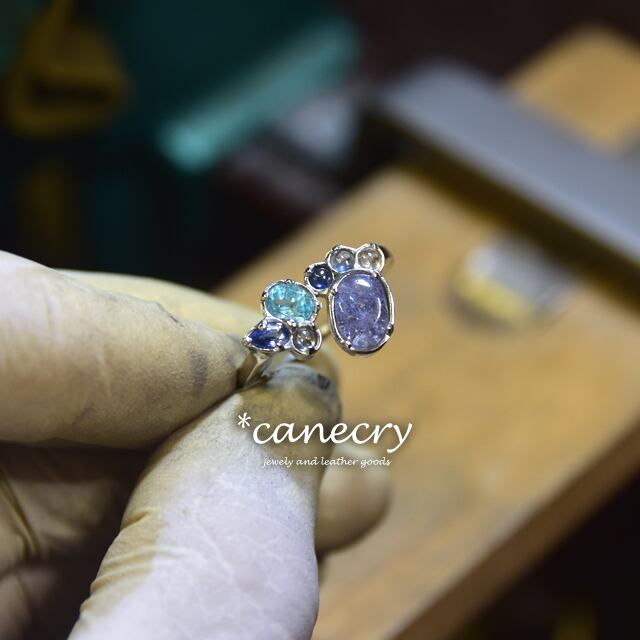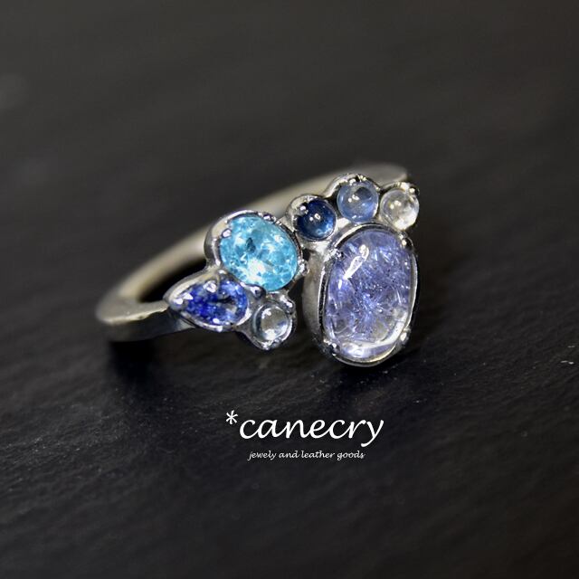 デュモルチェライトinクオーツとサファイア、アパタイトと小さなカボションのサファイアがおりなす青のリングです。