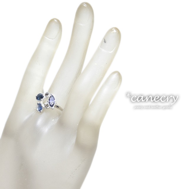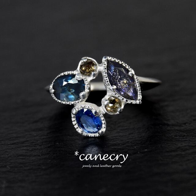 マーキスのアイオライトサンストーンならびに青いサファイア、2粒のブラウンダイヤモンドとバイカラーサファイアのリングです。