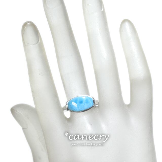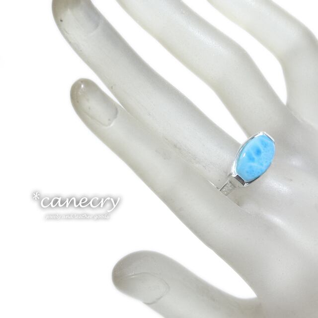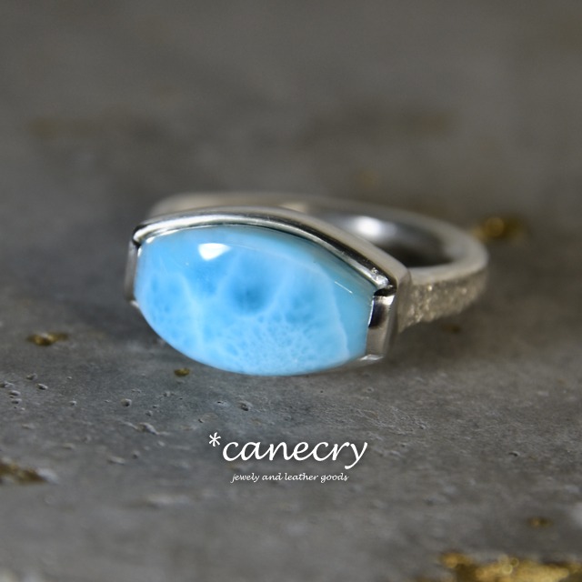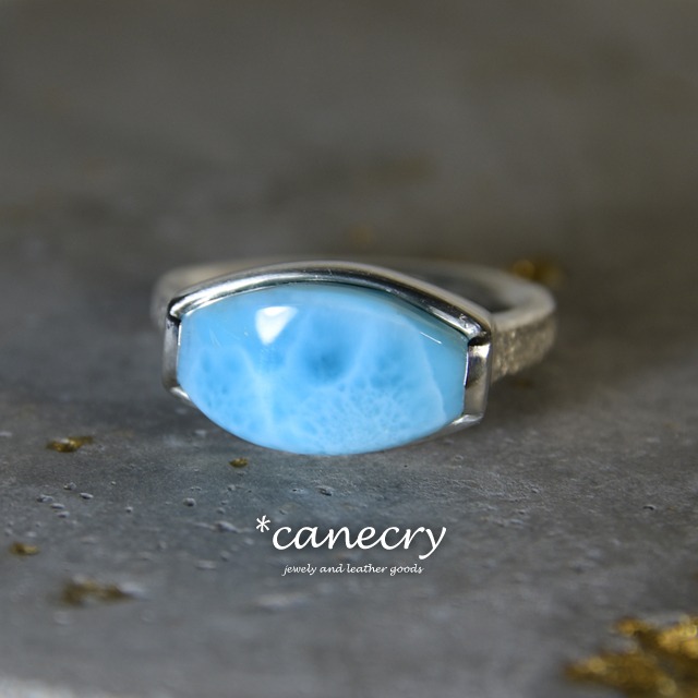 ドミニカ産の大粒なラリマーを使った、個性的なデザインのリングです。